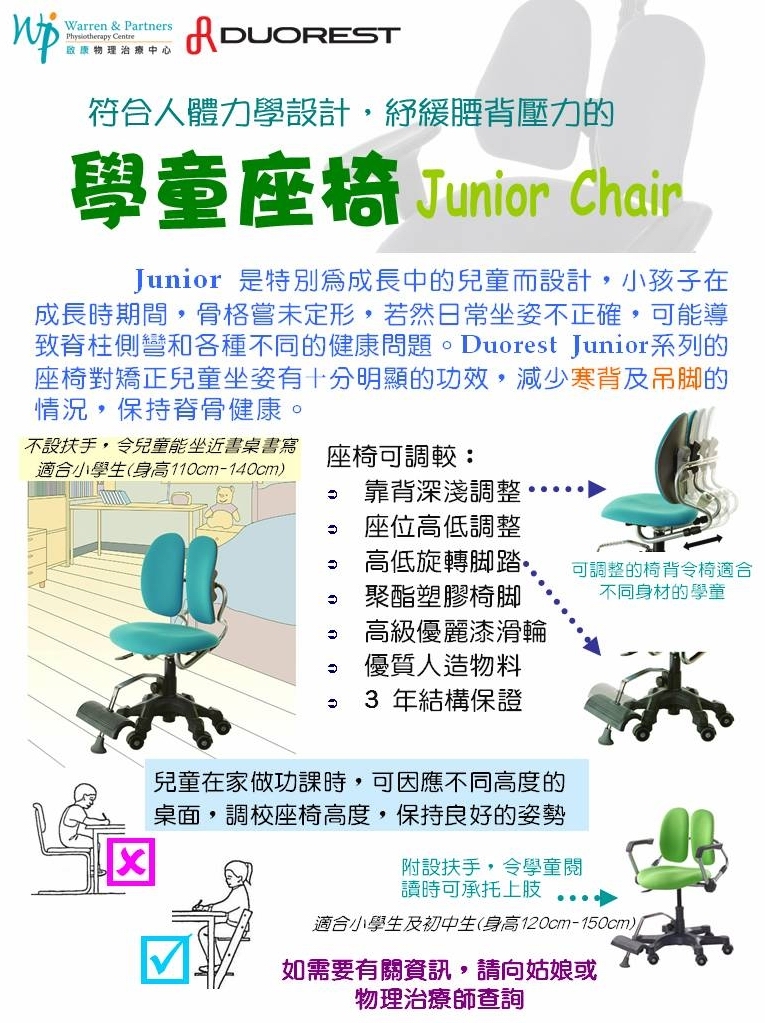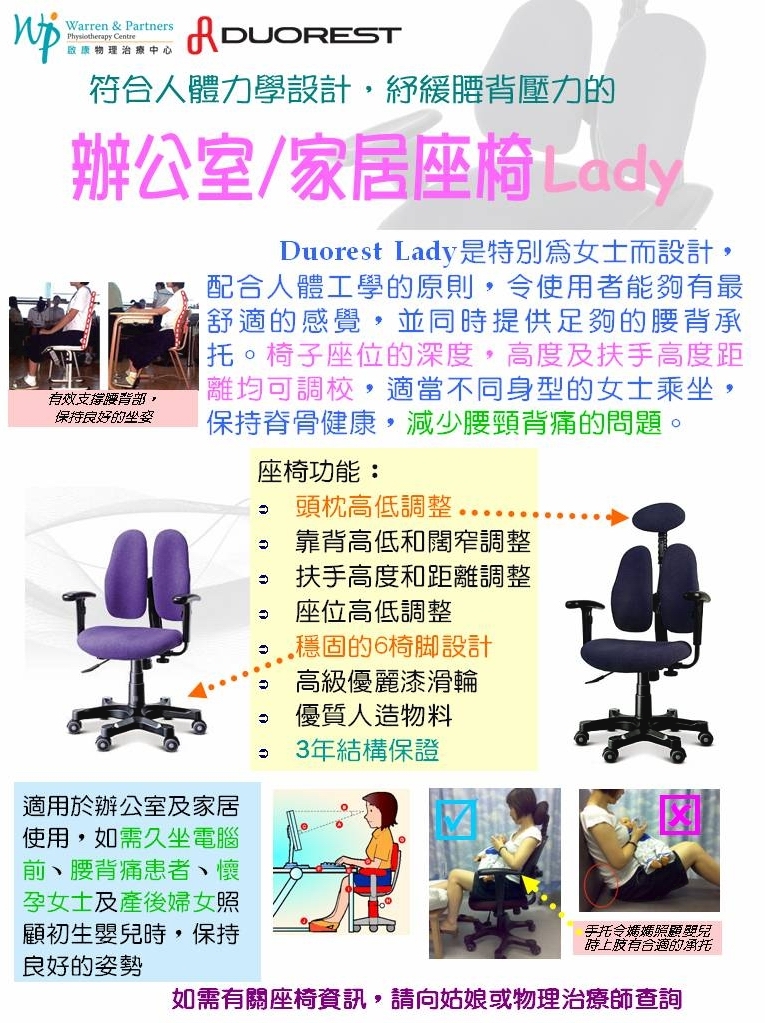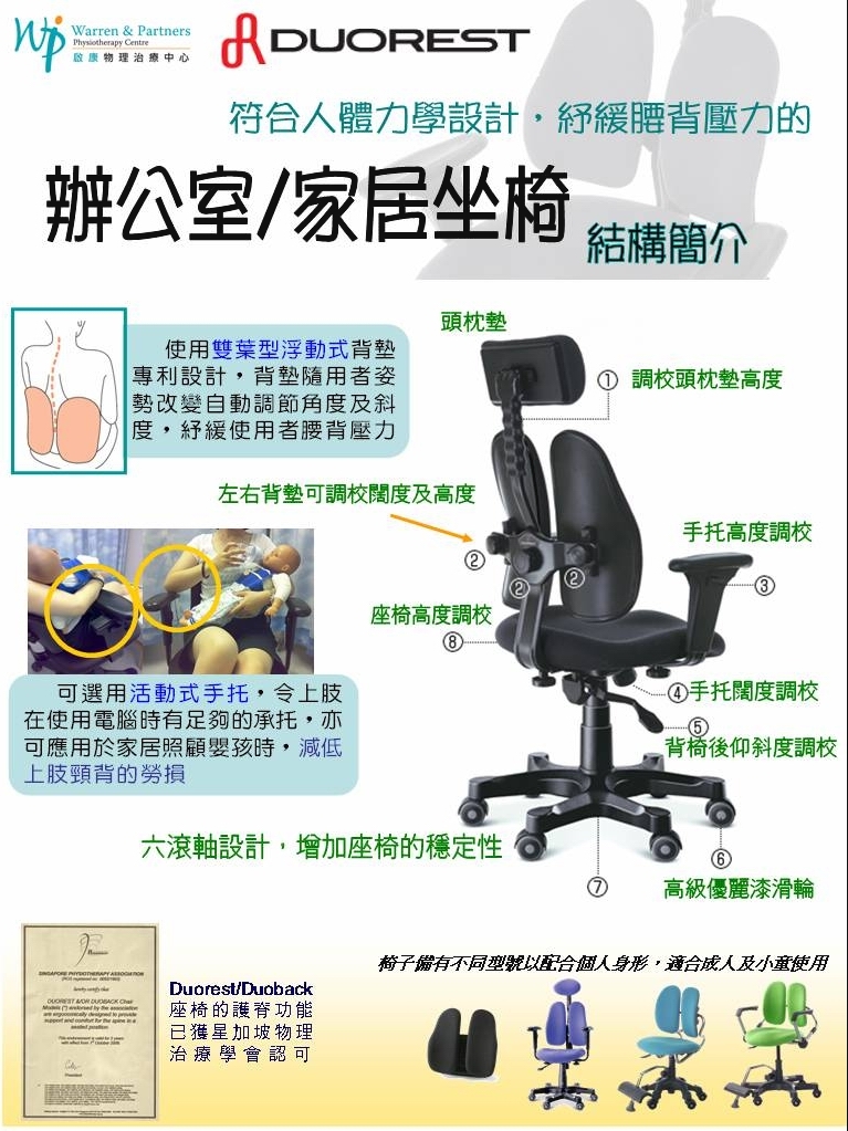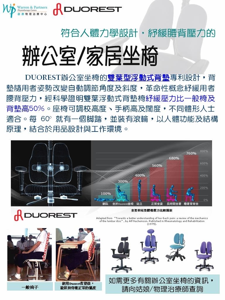 對長時間坐下工作的人士,一張舒適耐用,而且符合人體力學設計的坐椅,對保持正確姿勢,預防及減低腰頸背痠痛非常有效。有見及此,本物理治療中心黃埔診所及荃灣診所現添置獨特設計的DUOREST辦公室坐椅,供到診人士試坐。